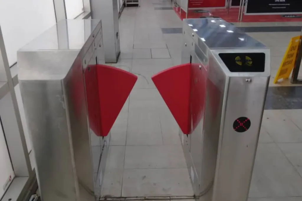 Full-height turnstile gates installed to enforce strict access control, prevent tailgating, and ensure maximum perimeter security.