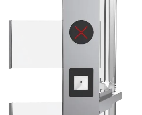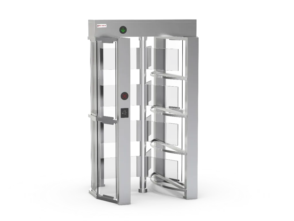 HR401G – Glass Full Height Turnstile Tempered glass side panels, plexiglass/acrylic arms, anti-tailgating function, quiet absorber mechanism, LED indicators, bi-directional control, access control integration Maximum security Embassy, fitness centers, bank, hotels