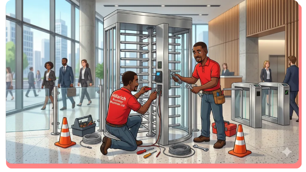 Hillarich Business Machines Ltd provides professional full-height turnstile installation services for airports, correctional facilities, industrial sites, stadiums, government institutions, and high-security environments across Lagos.