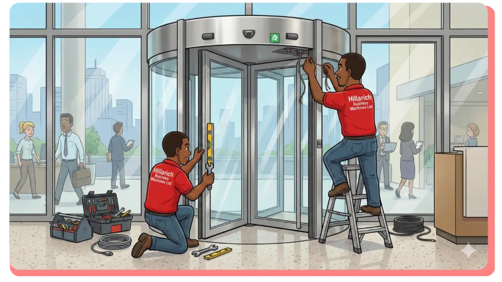 Hillarich Business Machines Ltd provides professional revolving door installation services for hotels, corporate buildings, airports, hospitals, and commercial facilities across Lagos.